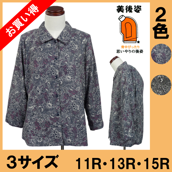背中が出ないように、背中の曲がりに対応した「美後姿」シリーズです。肌寒くなる季節に丁度良い、少し厚めの生地を使った落ち着いた色目のプリントブラウスになります。名前の書ける便利な「名前ネーム」付きです。