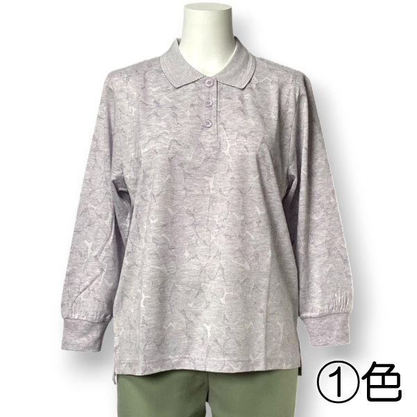 カノコ地に小花柄総プリントが入った長袖ポロシャツ