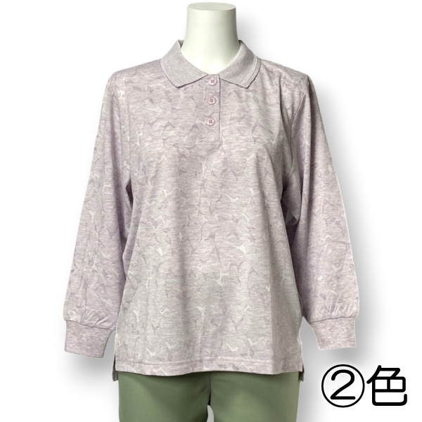 カノコ地に小花柄総プリントが入った長袖ポロシャツ